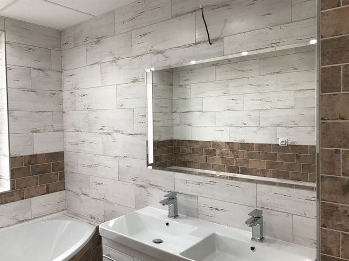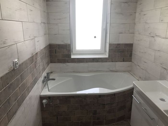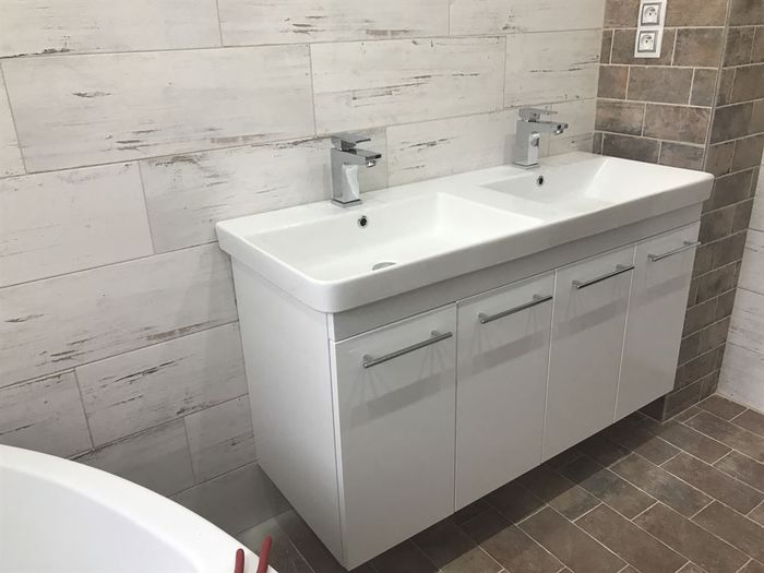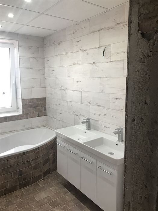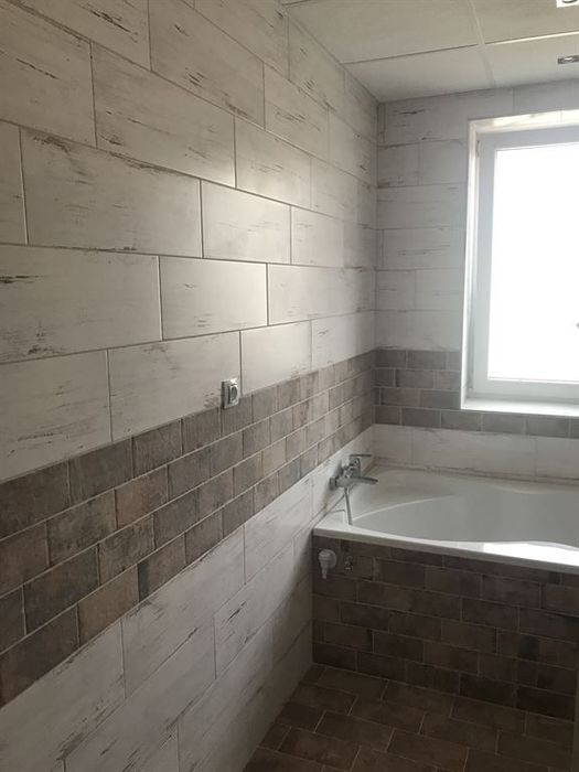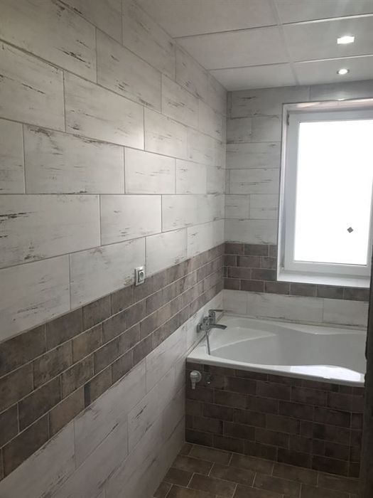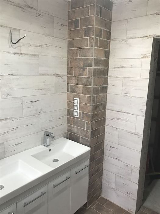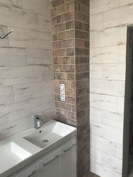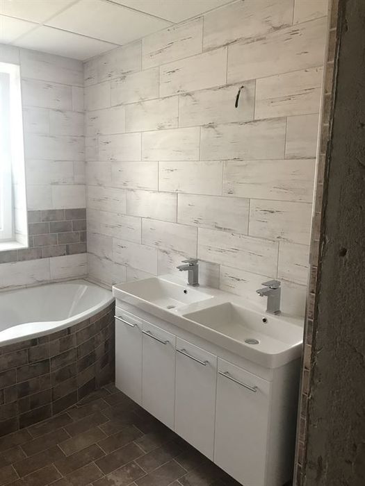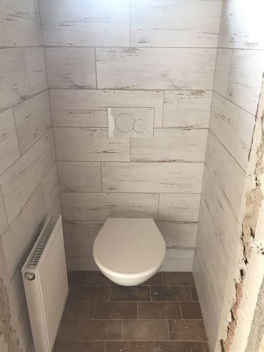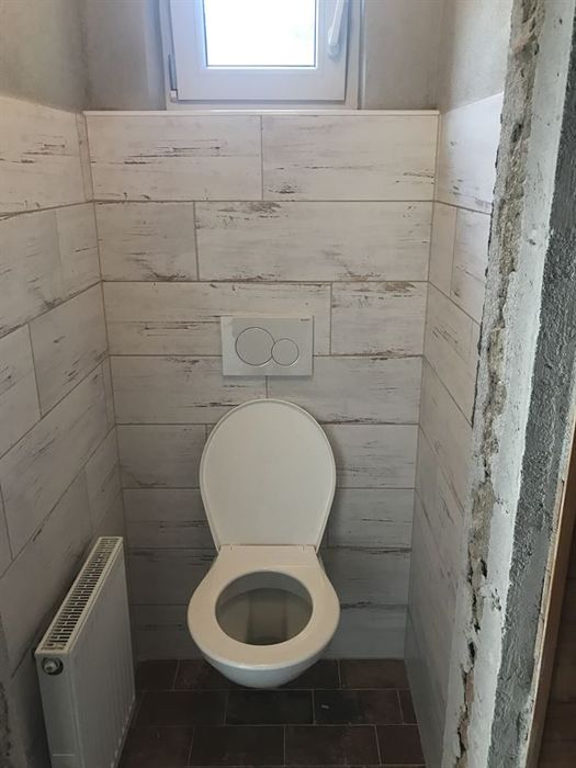 V RD jsme prováděli rekonstrukci koupelny a WC. Stěny byly kompletně nově omítnuty a vyrovnány pro obklad. Podlaha byla vylita nivelací. Původní plechová vana byla nahrazena novou moderní plastovou vanou od Santechu. Stěny a podlaha jsou obloženy obkladem a dlažbou Country. Umyvadlo s nábytkem je od českého výrobce Krajcar. Baterie jsou také od české firmy Novaservis. Konstrukci WC jsme použili od Geberitu.