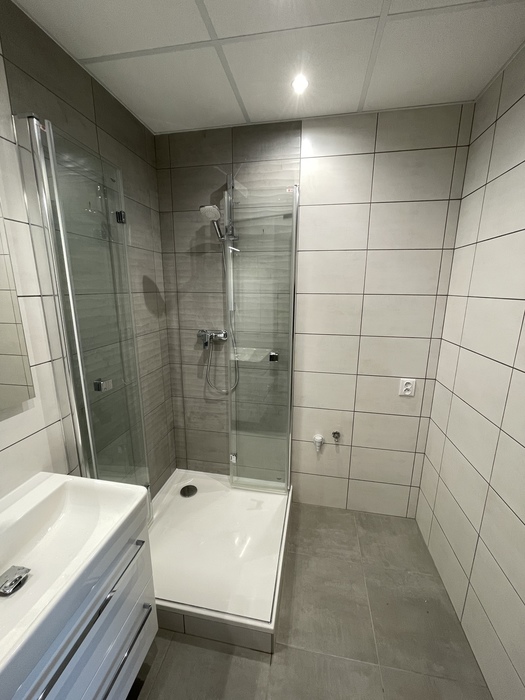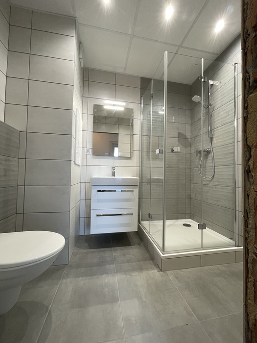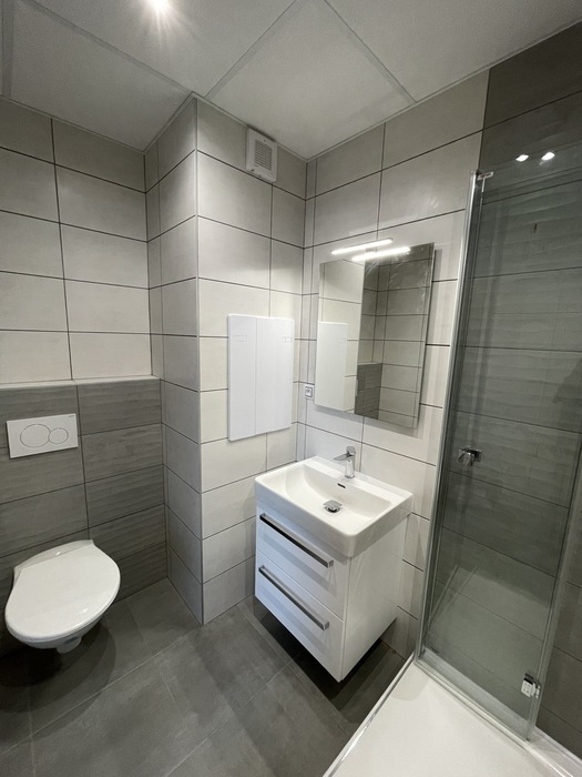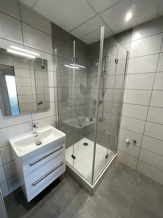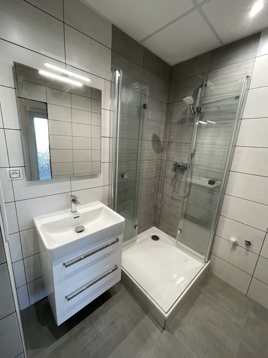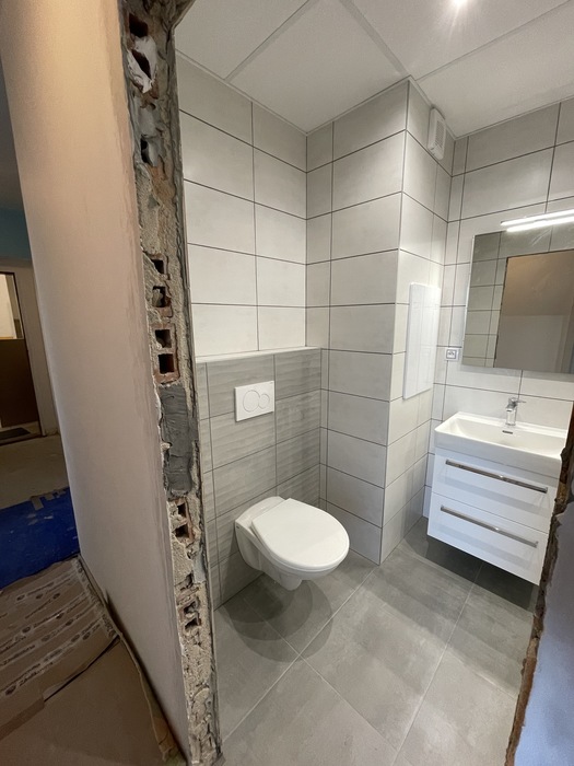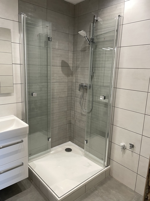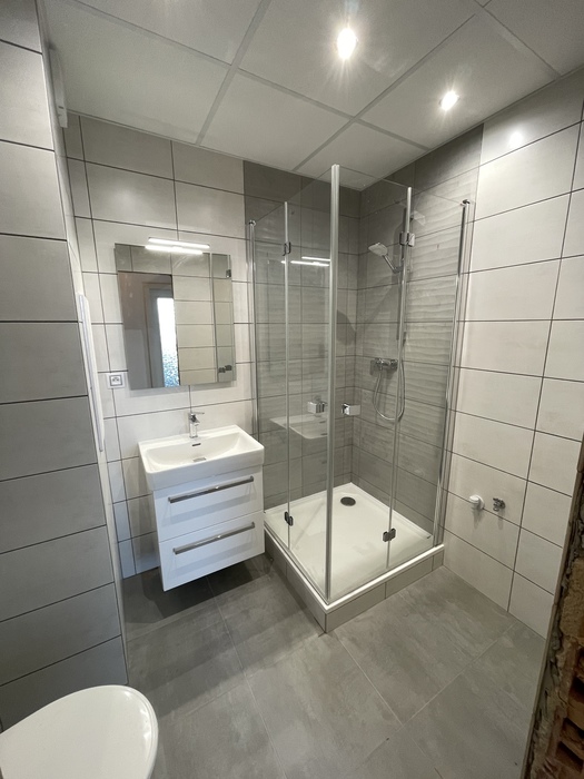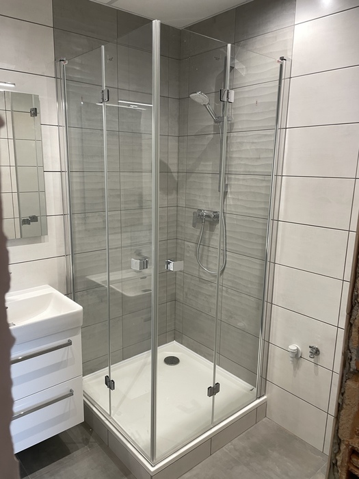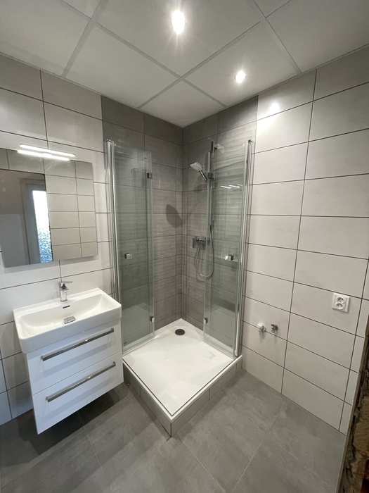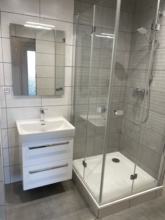 V cihlovém bytu 3+KK Na Kopcích jsme prováděli rekonstrukci koupeny. Koupelnu jsme vybourali (původní koupelna byla osazena plechovou vanou), kompletně osekali a stěny jsme museli celé vyrovnat. WC jsme vybourali a zrušili, na přání investorky jsme vybourali příčku mezi wc a šatnou, vybourali jsme a zazdili původní dveře do wc a tímto vznikla nová velká šatna. Původní koupelnu jsme dispozičně změnili tak, aby v nové koupelně mohl být osazen sprchový kout 90x90 s vaničkou z litého mramoru se skládacím skleněným sprchovým koutem, hranatým umyvadlem s nábytke 60 cm a zrcadlem s LED osvětlením od českého výrobce Krajcar, závěsným wc od firmy Geberit, a prostorem pro pračku. Koupelnové baterie jsme dodali a namontovali od českého výrobce Novaservis. Nová koupelna je osazena sníženým stropem s LED osvětlením.