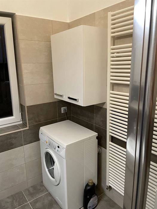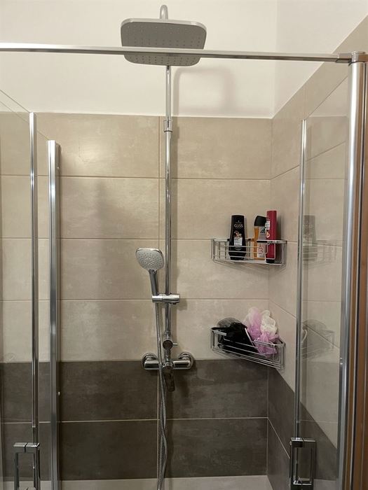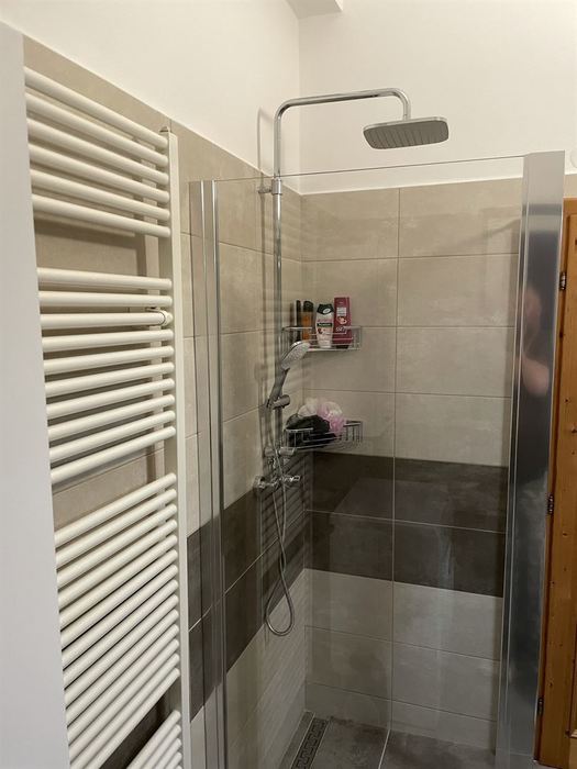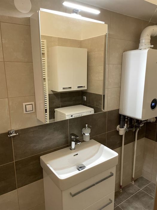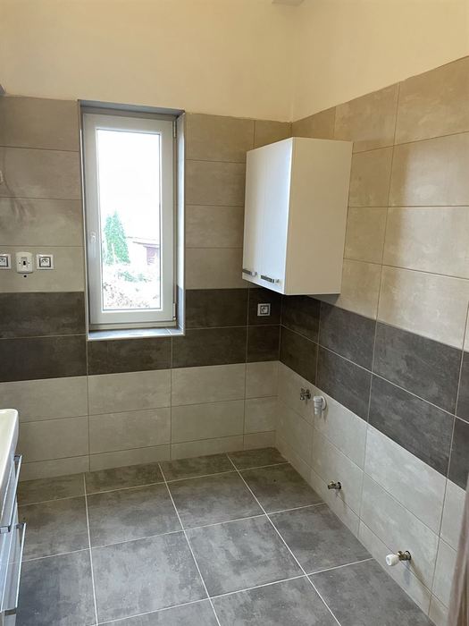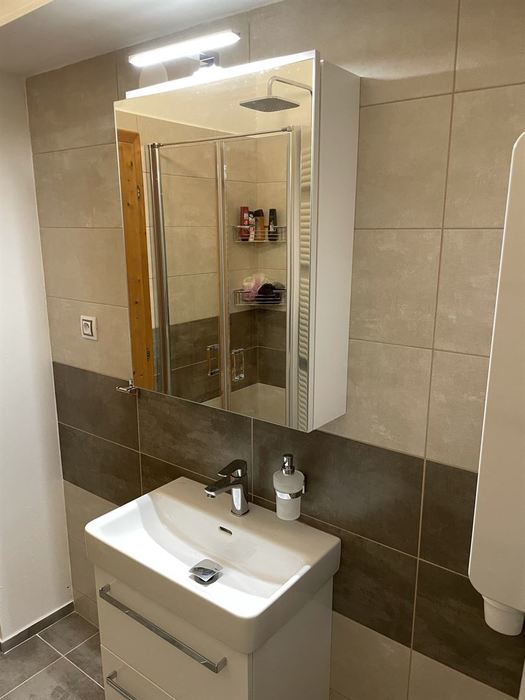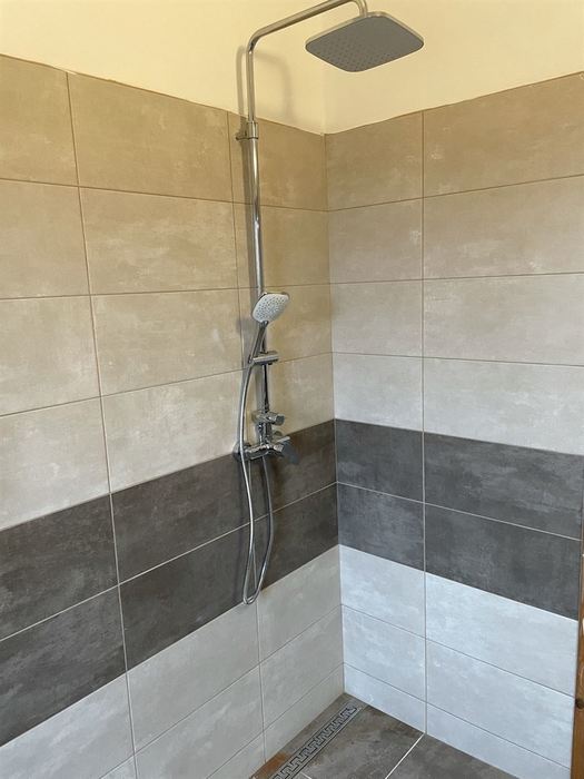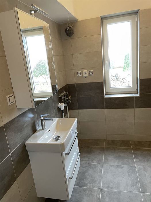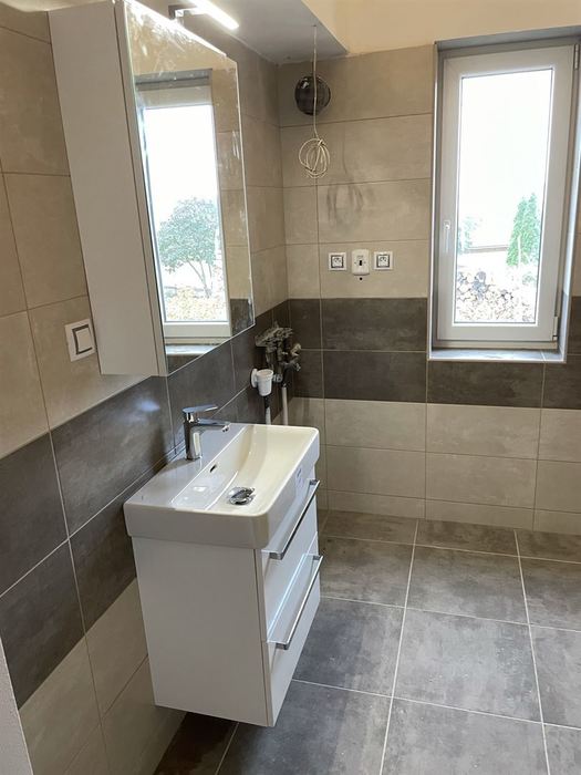 V RD jsme prováděli rekonstrukci koupelny. Původní koupelna byla kompletně vybourána ( byla osazena vanou). Stěny a podlahy byly upraveny tak, aby mohl být osazen sprchovým koutem s odtokovým žlabem. V nové koupelně je osazen sprchový koutu s pevnou boční stěnou a vstupními dveřmi v provedení "lítačky". Nový koupelnový nábytek od firmy Krajcar, sprchové baterie a doplňky od Novaservisu. Obklady a dlažba kolekce Smart.