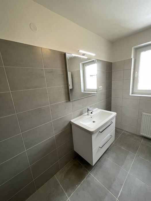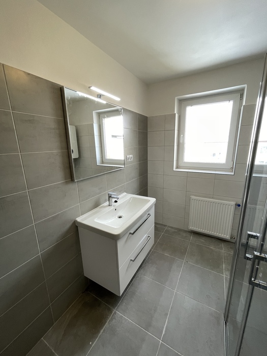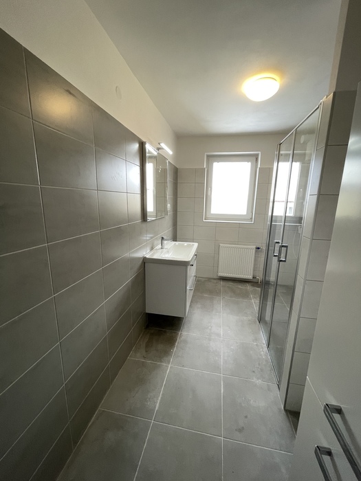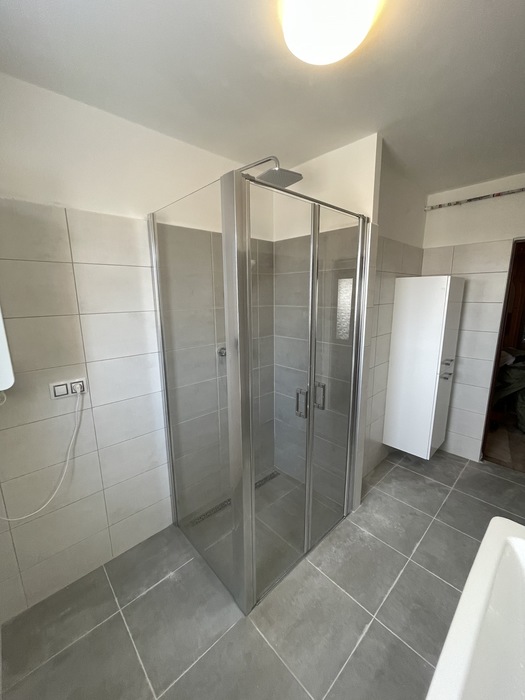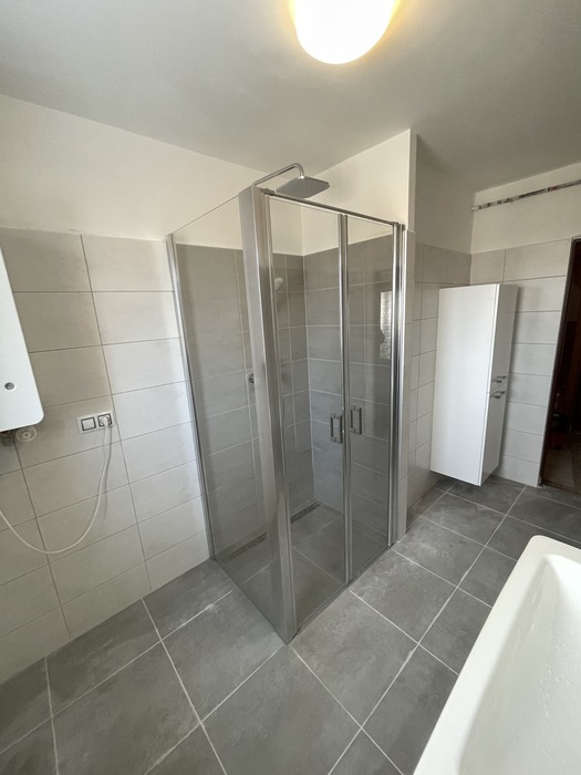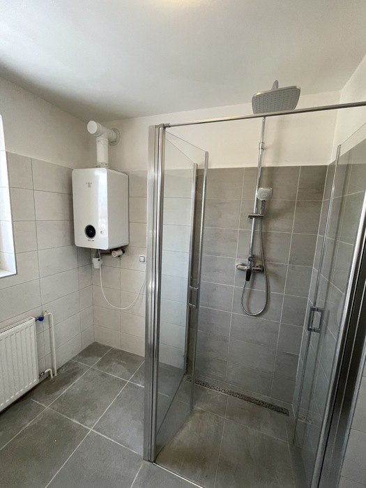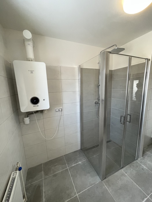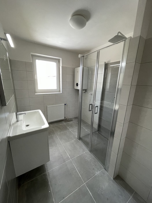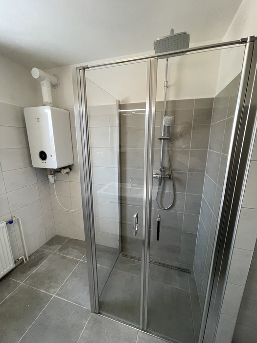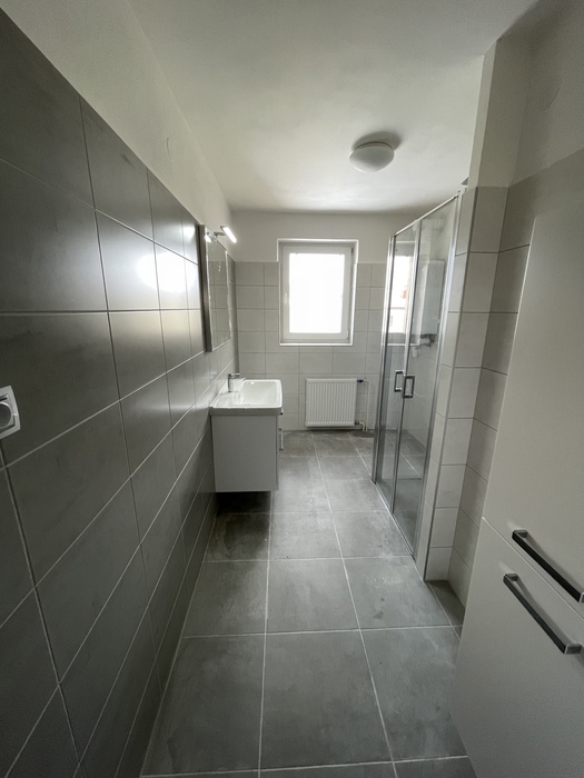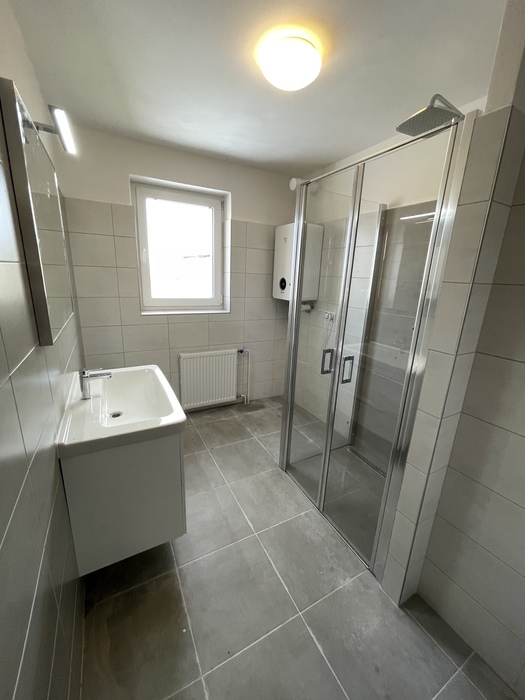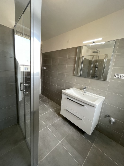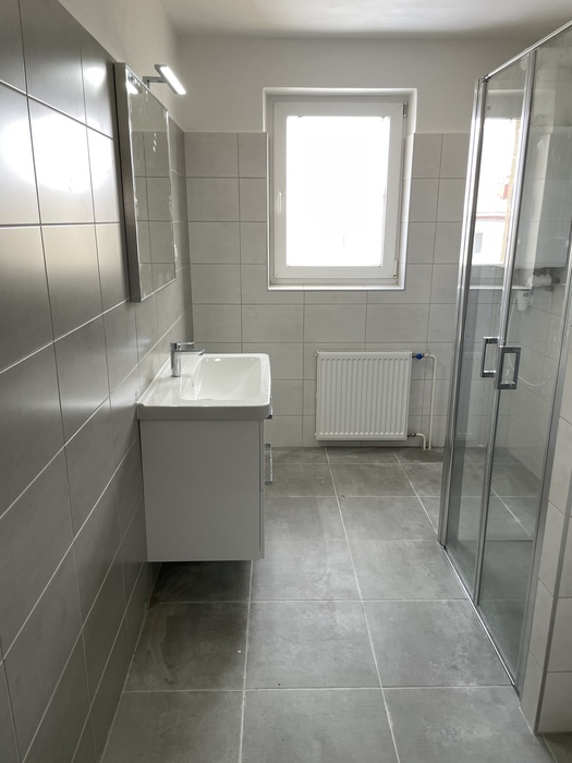 V cihlovém činžovním domě jsme prováděli rekonstrukci zděné koupelny a wc. Tato rekonstrukce, kterou jsme prováděli na klíč, je v Třebíči 4NP bytového cihlového domu. Původní koupelna s vanou byla kompletně odstraněna. Osekané stěny jsme vyrovnali a nově obložili. Toaleta byla nově obložena a je zachována původní dispozice. Nový koupelnový nábytek od firmy Krajcar, baterie od Novaservisu. Sprchový kout bez vaničky s odtokovým žlabem, dveřmi v provedení lítačky s pevnou boční stěnou.