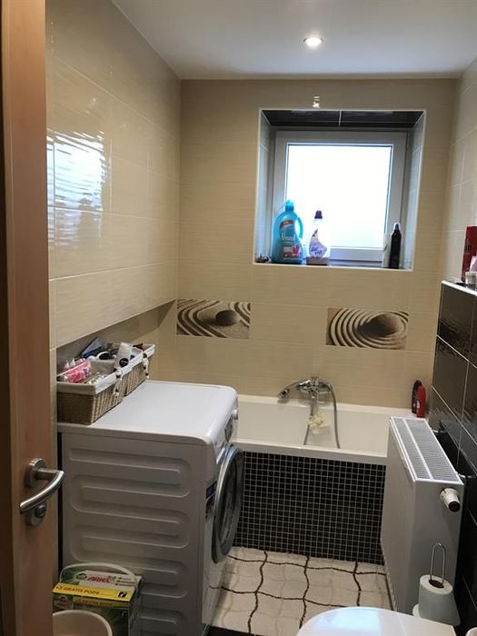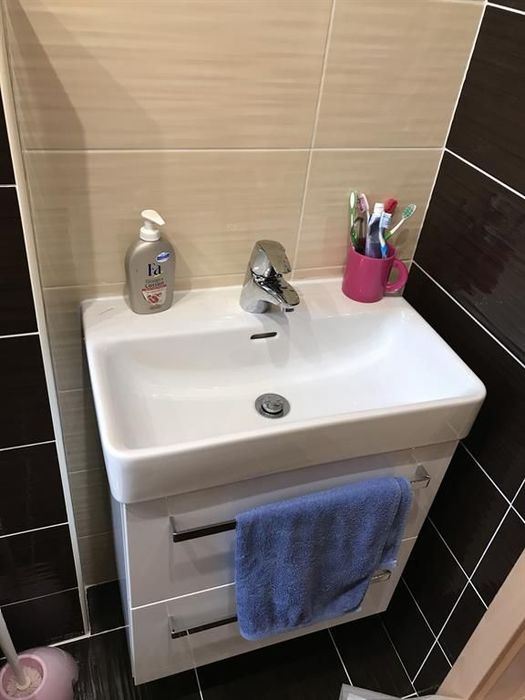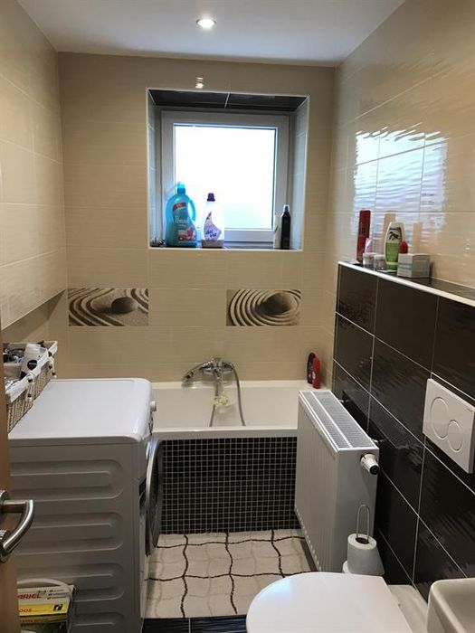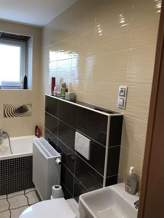Rekonstrukce koupelny v činžovním cihlovém domě. Původní koupelna byla kompletně vybouraná. Plechovou vanu jsme nahradili novou plastovou vanou od Santechu. Nová konstrukce závěsného WC od Geberitu. Koupelnový nábytek Krajcar - umyvadlo se skříňkou. Moderní nadčasový obklad Elida. Provedli jsme montáž sníženého sádrokartonového stopu do kterého jsme osadili LED bodovky na 12V, Rekonstrukce na klíč zahrnuje i novou vodu, odpady a elektroinstalaci. Topení bylo zasekáno pod omítku.