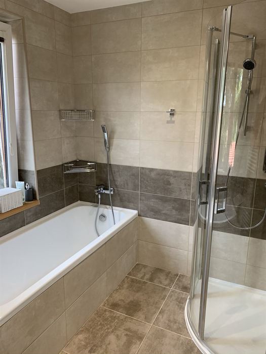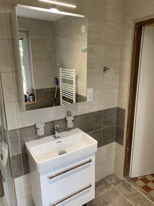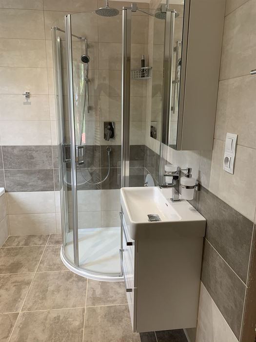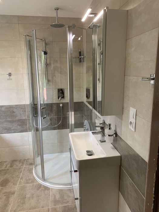 Ve starším RD jsme prováděli rekonstrukci původní koupelny pouze s vanou. Původní koupelnu jsme kompletně vybourali a do nové koupelny jsme osadili jak vanu tak sprchový kout. Z důvodu ušetření místa jsme koupelnu osadili umyvadlem s nábytkem se sníženou hloubkou a zrcadlovou skříňkou od od české firmy Krajcar. Koupelnové baterie a koupelnové doplňky jsou od českého výrobce Novaservis.