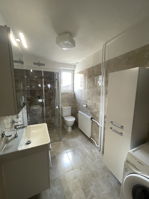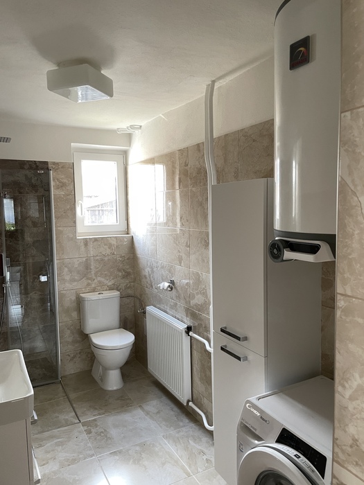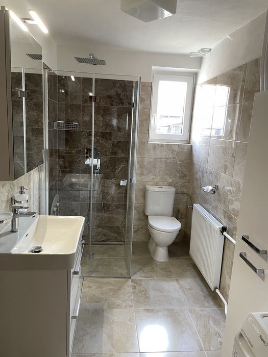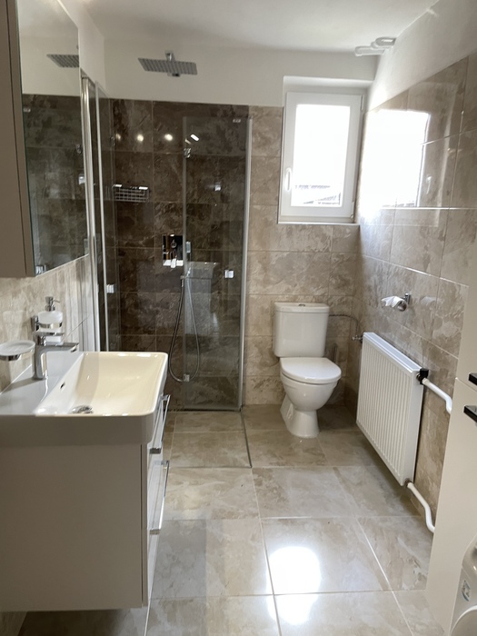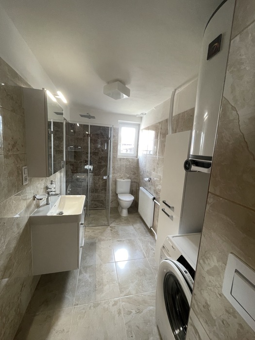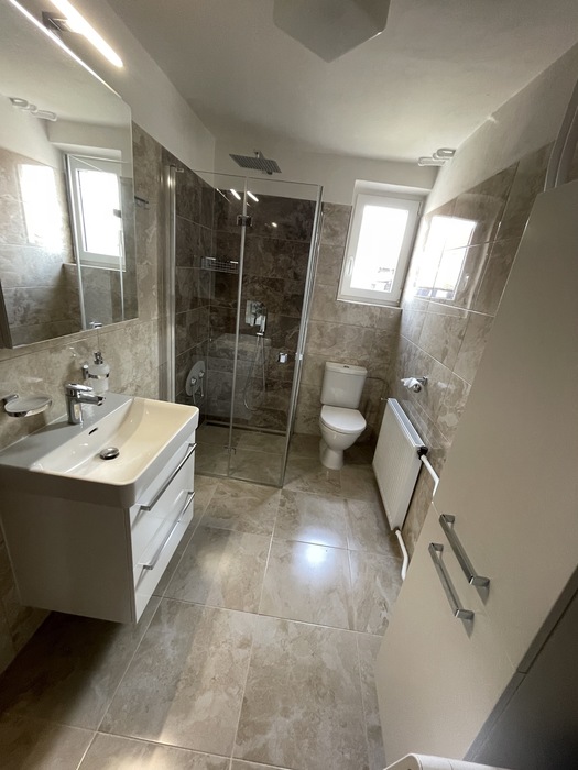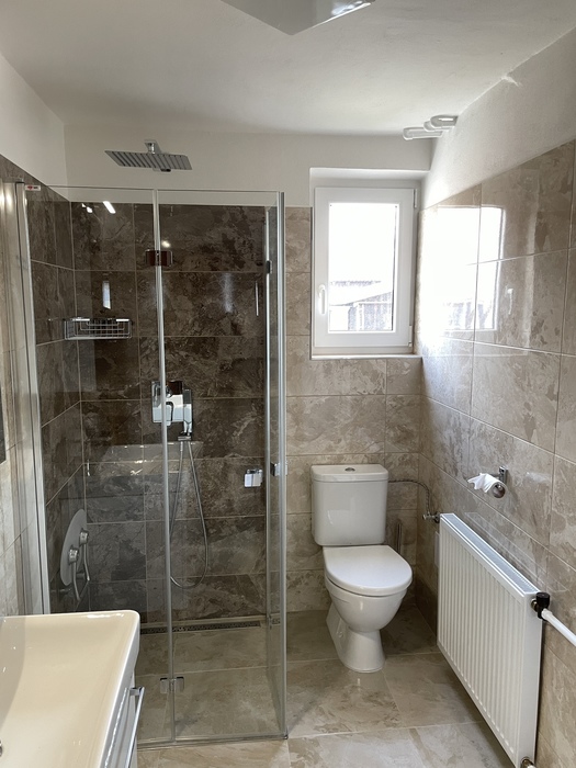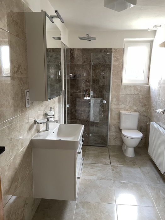 V rodinném domě na vesnici v okrese Třebíč jsme prováděli rekonstrukci koupelny v 1NP. Původní koupelna byla rozdělena příčkou na dvě malé místnosti (v přední bylo umyvadlo, pračka, bojler a v zadní byl malý sprchový kout a kombi wc. Příčku včetně původních obkladů jsme odstranili a vznikla velká prostorná koupelna s bezbariérovým sprchovým koutem, který je osazen pantovými skládacími prchovými dveřmi. Sprchový kout je osazen nerezovým odtokovým žlabem. Stěny jsme kompletně vyrovnali, podlahu předělali tak, aby byla koupelna bezbariérová. Podle našeho 3D návrhu jsme koupelnu obložili novými obklady a dlažbou. Do koupelny jsme osadili nový koupelnový nábytek Krajcar, nový bojler Dražice, kobmbi wc Jika Lyra, koupelnové baterie Novaservis a sprchový kout včetně příslušenství.