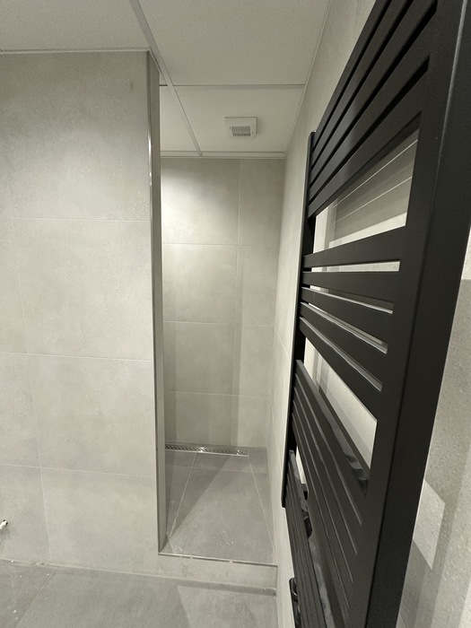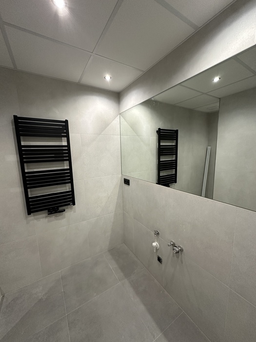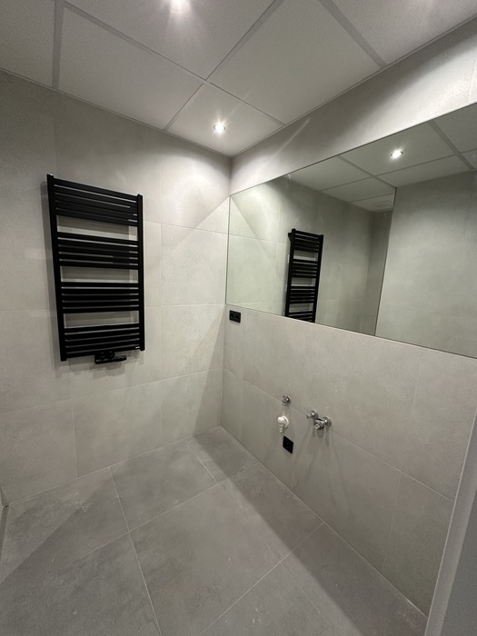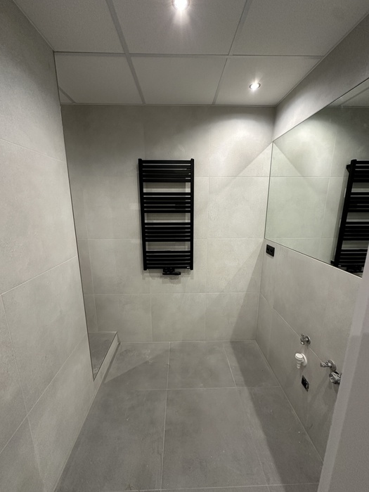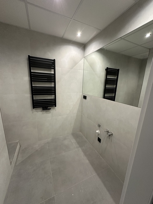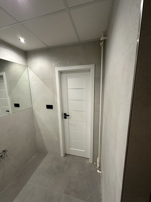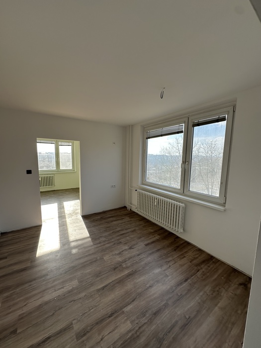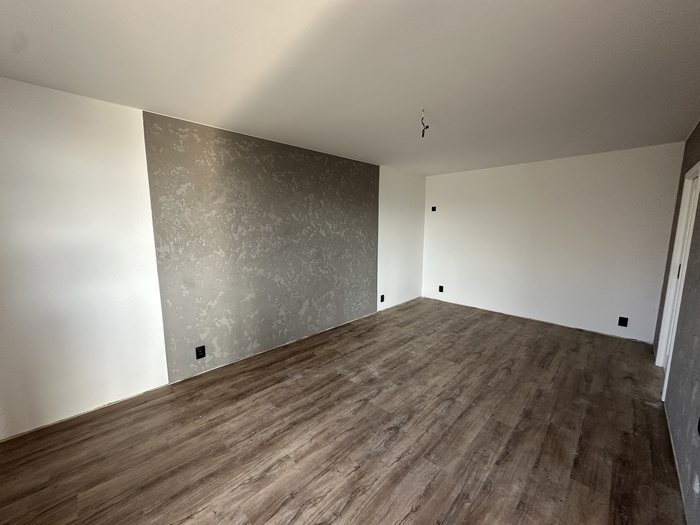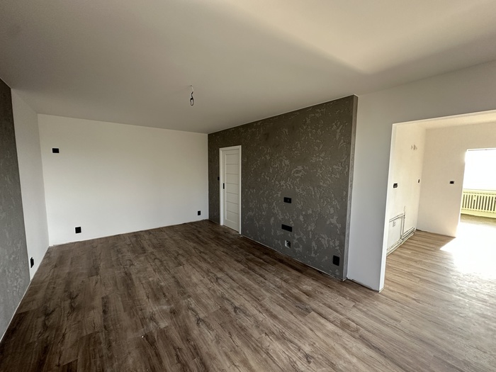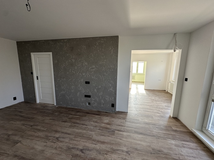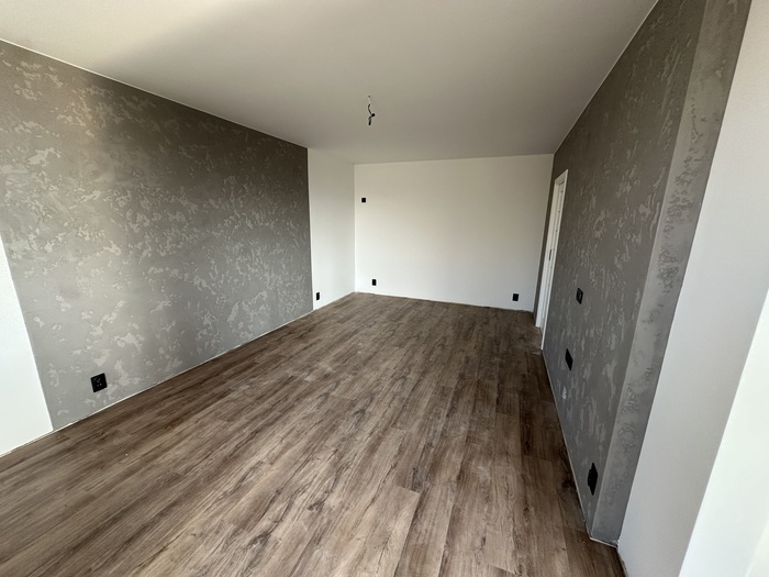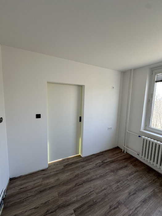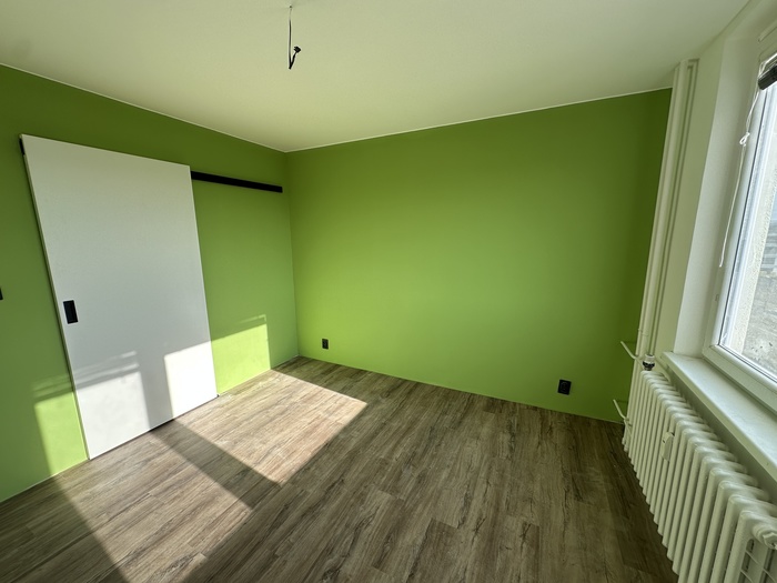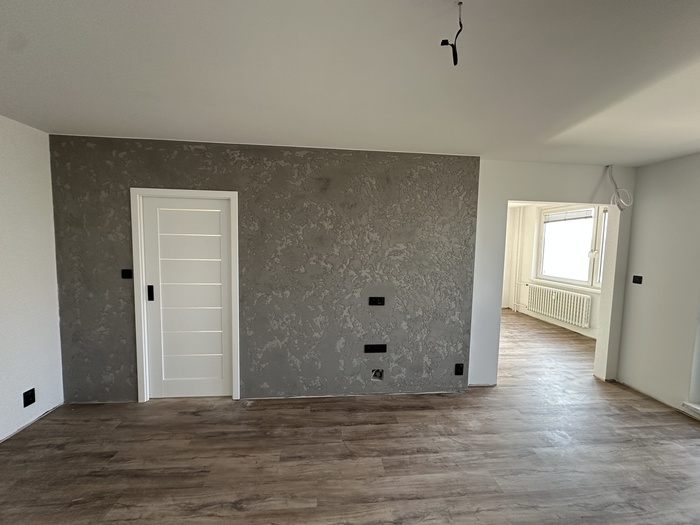 V bytě 3+1 jsme prováděli kompletní rekonstrukci interiéru bytu a bytového jádra na klíč. Provedeli jsme rozsáhlou rekonstrukci původního zděného jádra včetně prodloužení koupelny tak, aby v nové koupelně byl osazen zděný sprchový kout. Byl osazen nový závěsný záchod s konstrukcí od Geberitu, sprchový set od Hansgrohe, nerezový odtokový žlab ve sprchovémkoutě, zrcadlo je vsazené do obkladů. V obyvacím pokoji byl proveden výřez, aby se zvětšil přístup do kuchyně a také v ložnici byl proveden nový výřez panelu, aby jsme změnili umístění dveří. Oba výřezy jsou provedeny dle projektové dokumentace od projektanta - statika včetně vypažení železnou konstukcí dle projektové dokumentace, která byla součástí stavebního povolení. V celám bytě je nová elektroinstalace světelnycha azásuvkových okruhů, v pokojích jsou provedeny nové stěrkované omítky včetně nové výmalby, jsou položené nové vynilové podlahy a osazeny jsou nové bytové dveře a obložky. V obyvací pokoji jsou nové dekorativní stěrkované omítky - imitace betonu. Osazeny byly nové vstupní a protipožární bezpečnostní dveře Magnum od firmy HT Dveře.