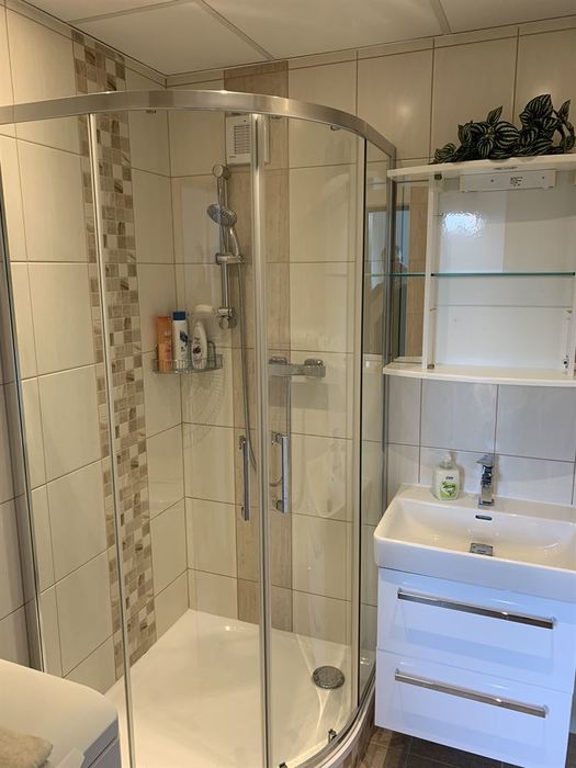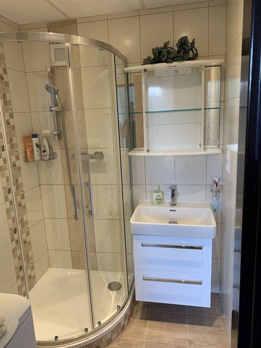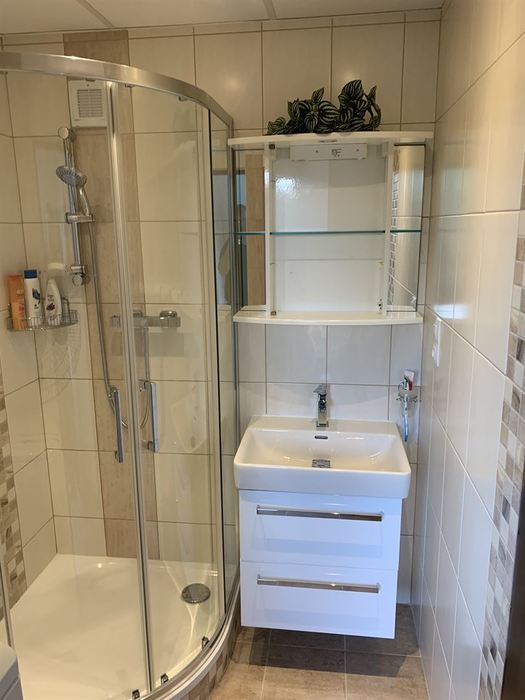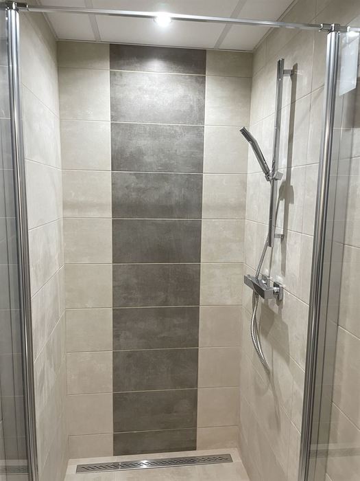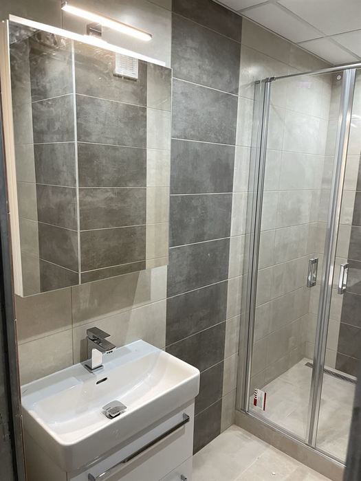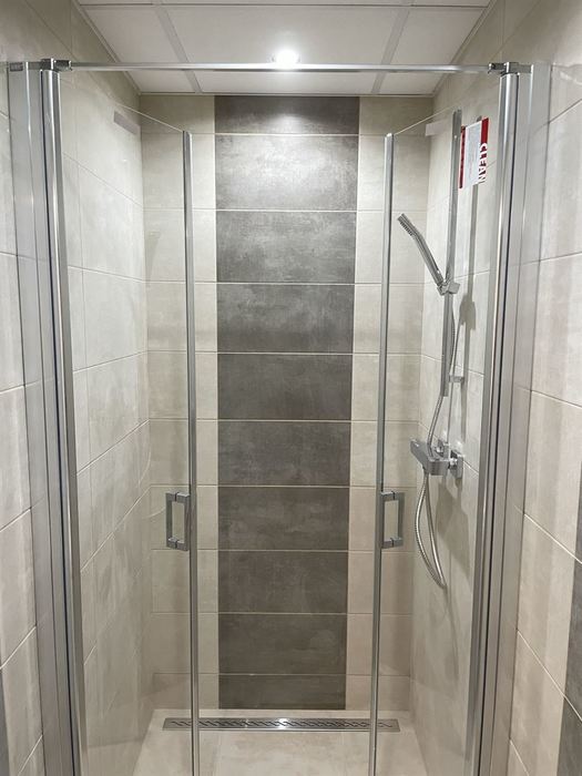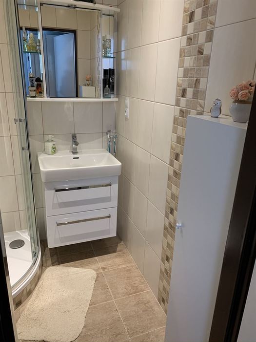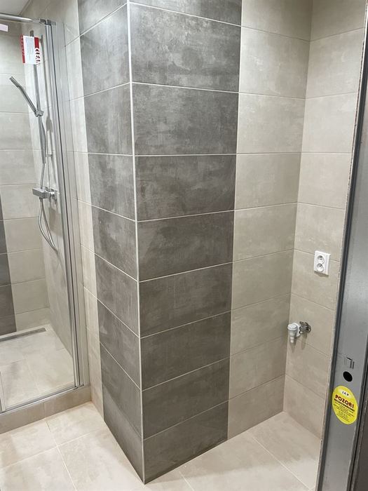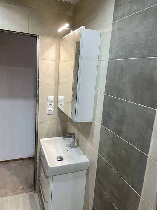 Místo umakartového jádra jsme postavili novou zděnou koupelnu a WC (nové zděné bytové jádro). Renovace proběhla v panelákovém bytě 2+1. Nová koupelna je osazena sprchovým koutem s odtokovým žlabem. Sprchové dveře jsou v provedení "lítačky" (otevírání dovnitř i ven) se vstupem středem. Koupelnový nábytek jsme nainstalovali od firmy Krajcar, koupelnové baterie jsou od Novaservisu. Do WC jsme nainstalovali kombik od Jiky. Koupelna i WC je osazena minerálním podhledem s bodovým LED osvětlením.