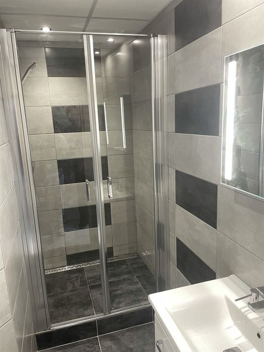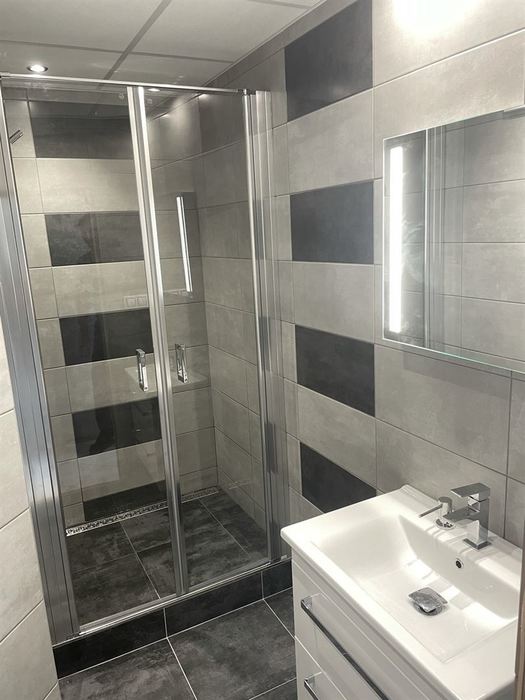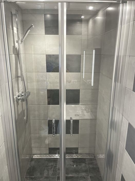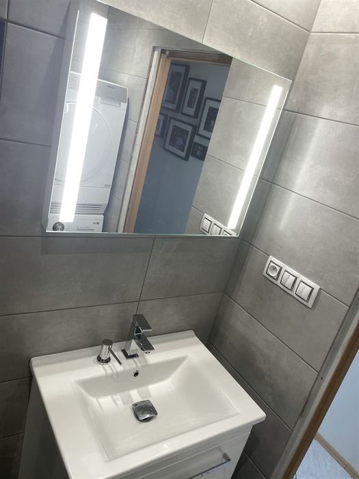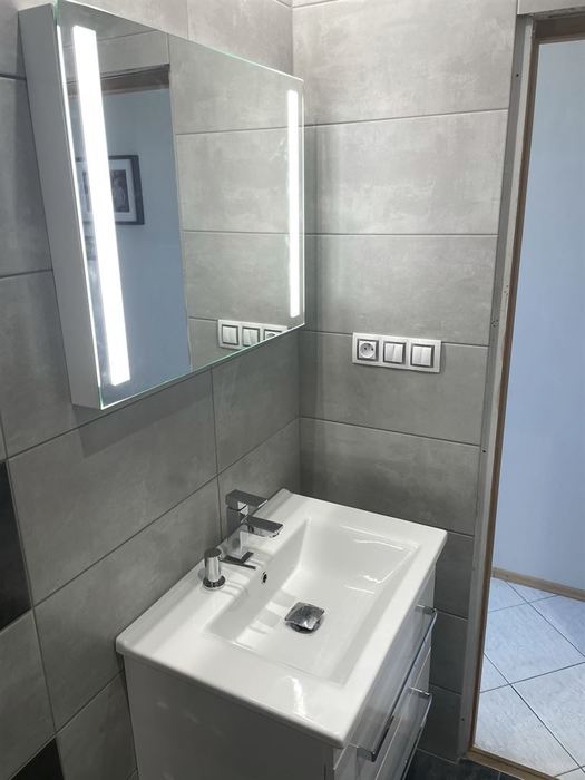 V bytovém jádře jsme zrenovovali: Nové obklady a dlažby, sprchový kout a odtokovým žlabem a skleněným dveřmi v provedení lítačky (otevírání vni/vně), nový koupelnový nábytek Krajcar, nové koupelnové baterie Novaservis, závěsné WC Geberit, minerální strop koupelny i toalety s LED osvětlením.