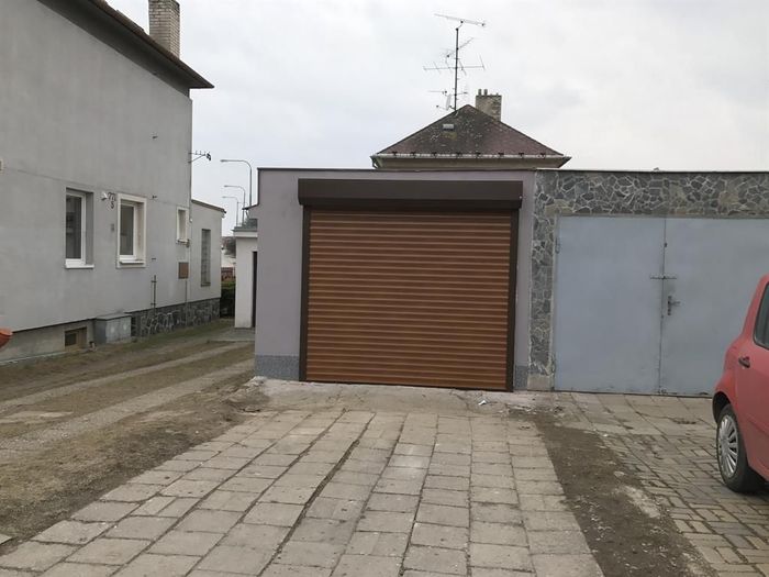 Do samostatně stojící garáže jsme montovali rolovací garážová vrata na fasádu. Tento typ vrat byl použit z důvodů nedostatku nadpraží z vnitřní strany garáže. Garáž nemá jiný vstup je použit nouzová zámek pro případ, že nepůjde elektřina. Barevné provedení je: ZLATÝ DUB. Tento typ vrat lze montovat jak z venkovní strany tak do vnitřku budovy. Vrata se rolují do boxu nad otvorem.