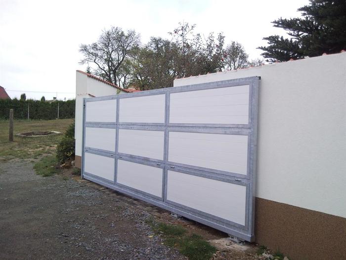 Samonosná vjezdová brána je provedena z pozinkované oceli. Výplň brány je osazena plastovým profilem bílé barvy s povrchovou imitací dřevěných palubek. Ovládání brány je motorem s dálkovými ovladači. Motor této brány je namontován ve výklenku zděného plotu. Z tohoto důvodu jsou spodní sekce vyrobeny na panty a jsou zamykatelné. Motoru je tak přístup pouze z venkovní strany ( z vnitřní strany je motor osazen pod úrovní terénu). Brána je namontována ve Starči na okrese Třebíč.