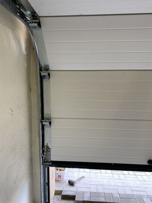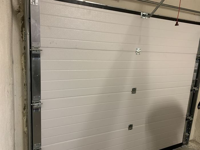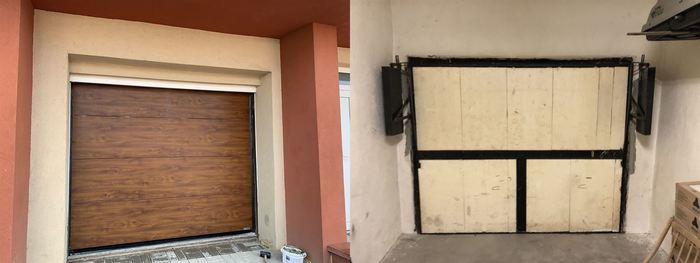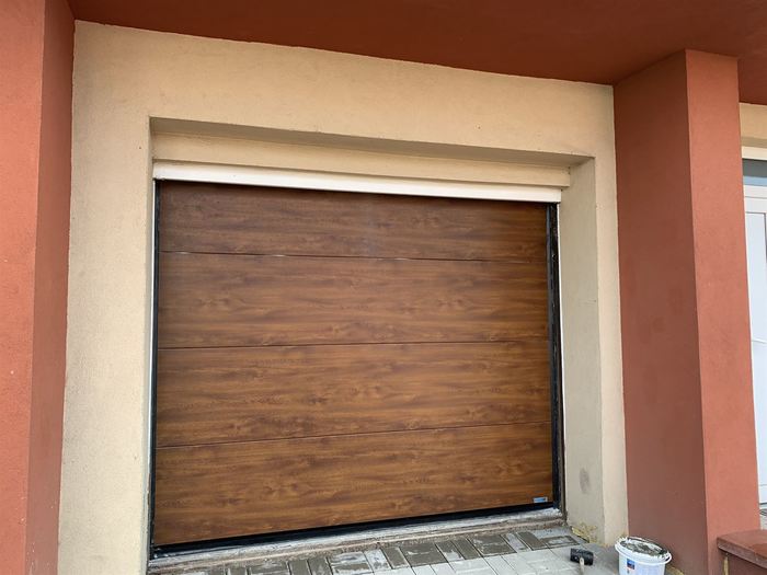 Do samostatně stojícího domu jsme dodávali a montovali, v rámci rekonstrukce interiéru, garážová sekční vrata. Vrata jsou osazena motorem s dálkovým ovládáním. Vrata jsou v dekoru dřeva a sekce jsou hladké (bez dekoru). Původní výklopné vrata byly odstraněny, ale zárubeň zůstala.