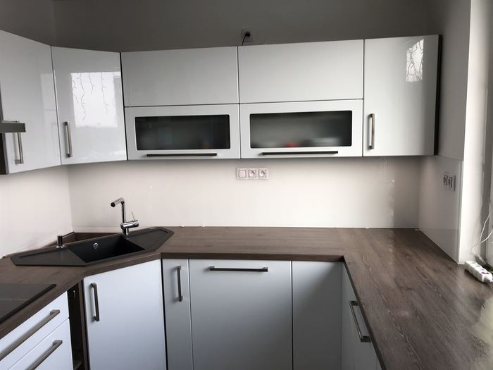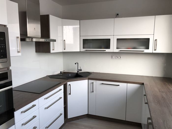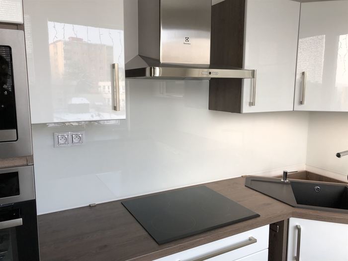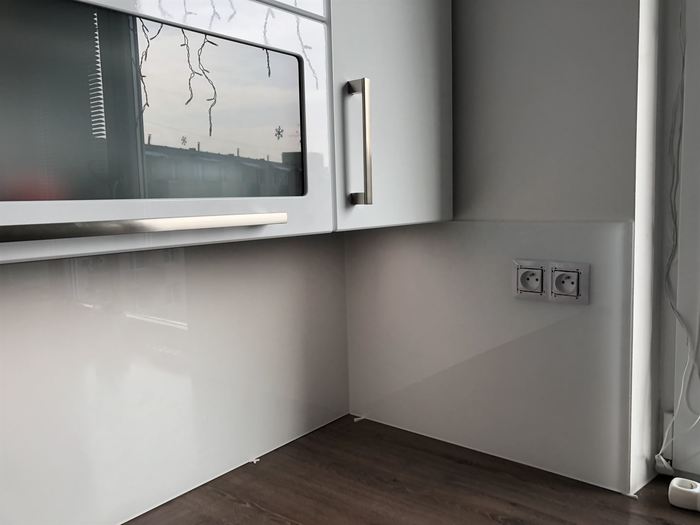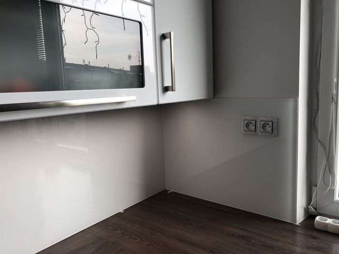 Po rekonstrukci bytového jádra a interiéru bytu jsme montovali kalené, lakované sklo jako obklad za kuchyňskou linku. Sklo je zaměřeno a vyrobeno na míru po montáži kuchyňské linky. Sklo je o síle 6 mm a je kalené. Barvu skla si vybírá zákazník. Tato realizace je bílá dle RAL a jak je vidět bílá je moderní a elegantní, Skleněný obklad kuchyně je nejen moderní a elegantní, ale i praktický (sklo nemá o proti obkladu spáry a výborně se udržuje.