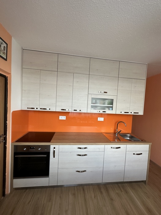 Po rekonstrukci bytového jádra v bytě 3+1, kterou jsme prováděli na klíč, jsme do nové kuchyně montovali lakované sklo jako obklad pracovní plochy kuchyňské linky. Sklo je vyrobeno podle našeho zaměření a nalakovánao v barvě ze vzorkovníku RAL dle výběru zákazníka. Sklo je v deska celku bez spár a je kalené o síle 6mm.