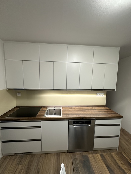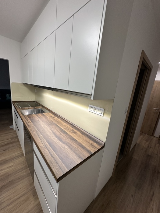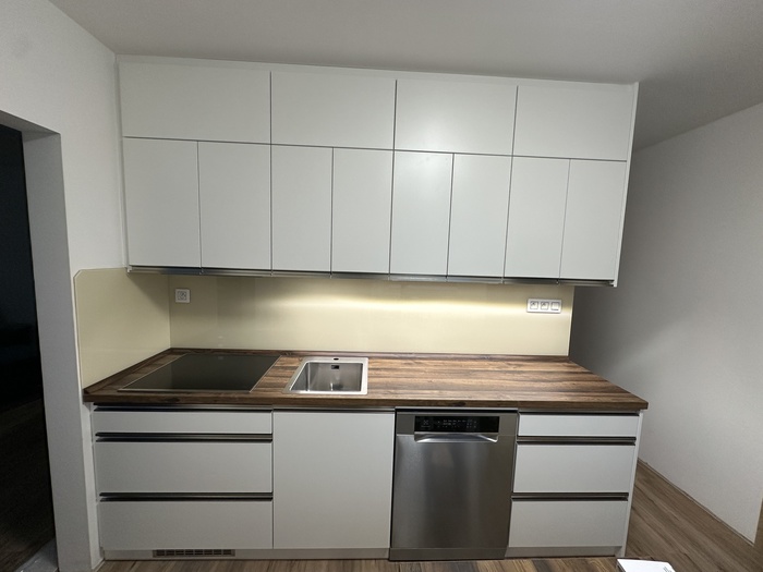 Po kompletní rekonstukci bytu 3+1 na klíč, jsme do nové kuchyně prováděli montáž skleněného obkladu pracovní plochy kuchyňské linky. Skleněný obklad na míru je nadčasový a hlavně je na rozdíl od obkladaček, které mají spáru, lepší na údržbu.